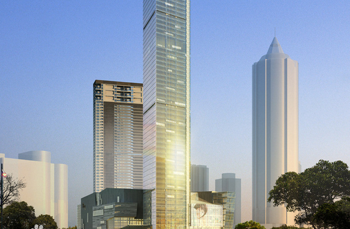 工程位于无锡中心区域,人民路与新生路交叉口南侧,北至人民中路、东至新生路,处于CBD的核心位置。总占地面积23050m2,总建筑面积318055m2。工程由地下4层、地上2幢塔楼和商业裙楼组成,其中北塔68层,高328米,采用框架核心筒结构形式;南塔48层,高169米,采用框架剪力墙形式结构。
