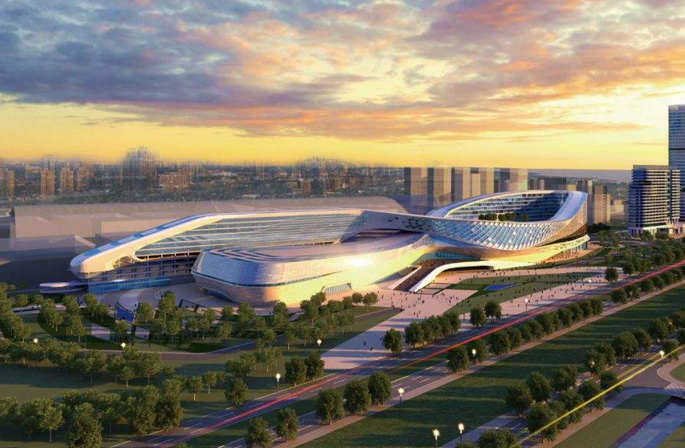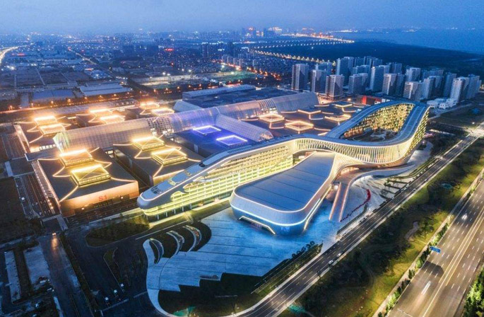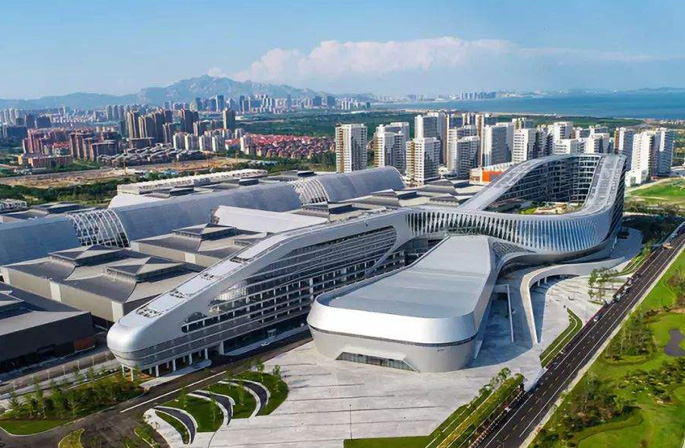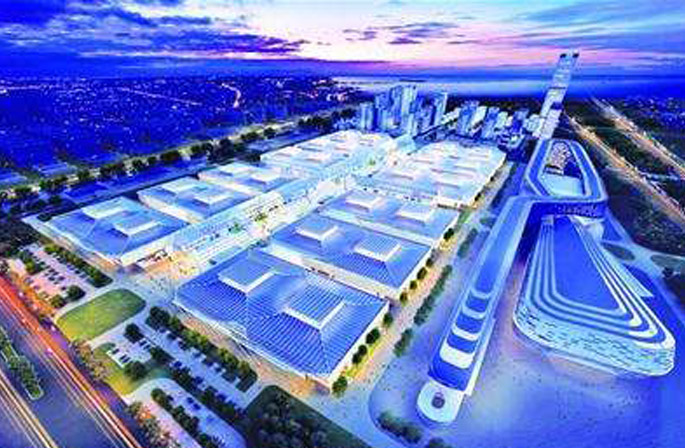 该项目位于西海岸新区核心区南侧,紧邻滨海大道,总占地约3000亩。一期为会展会议中心,紧邻三沙路,共占地约500亩,室内展馆面积20万平方米,室外展览面积3万平方米。展馆由12个150×66米的矩形场馆组成,可提供6300个国际标准展位。